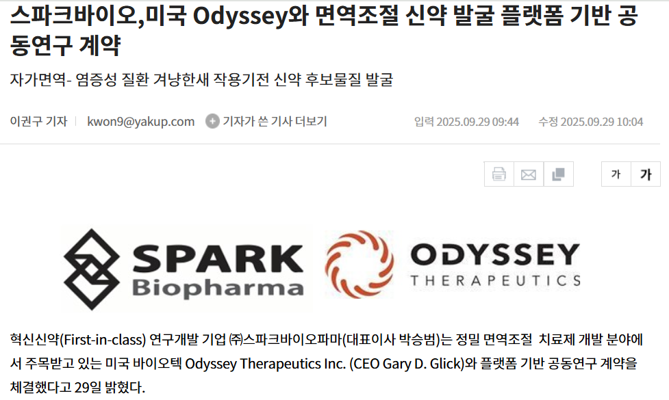 스파크바이오, 미국 Odyssey와 면역조절 신약 발굴 플랫폼 기반 공동연구 계약 체결